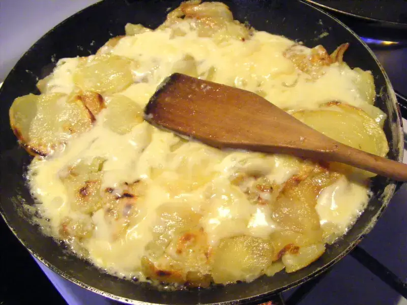 Célèbre spécialité culinaire fromagère originaire de l'Aubrac, la truffade se compose traditionnellement de pommes de terre, de tome fraîche, d'ail et de sel.